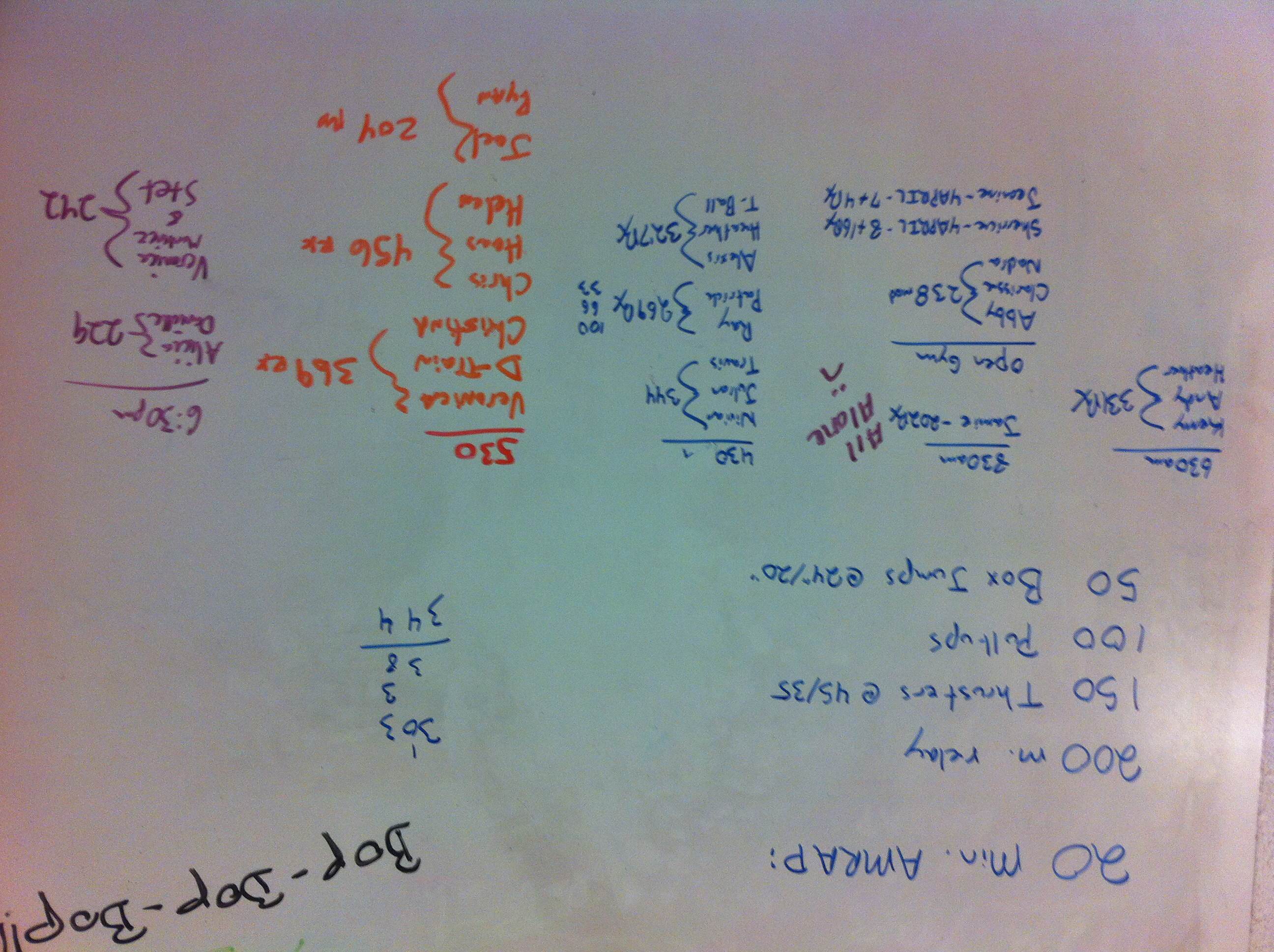 **1 person works, 1 person holds a medball(20/14lb) over head, 1 person rests
