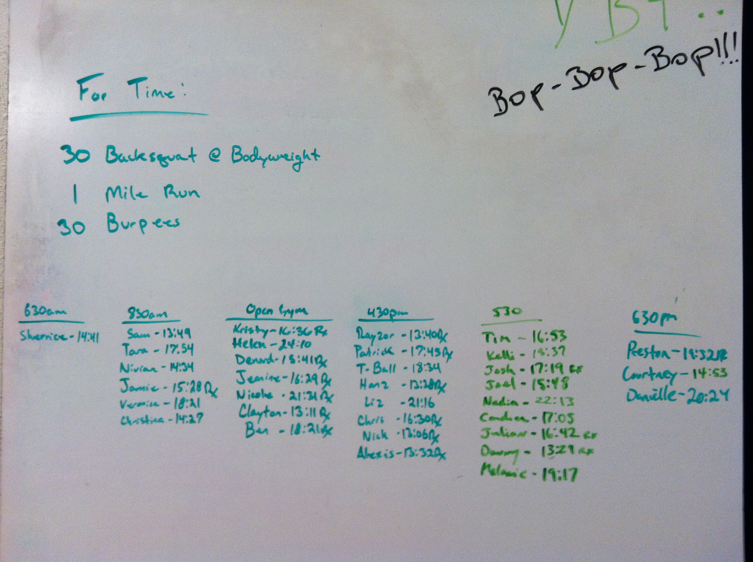 April 21, 2014 WOD Posted onApril 20, 2014April 21, 2014AuthorClaytonLeave a comment For Time: Back Squats @ body weight – 30 reps 1 mile run 30 Burpees