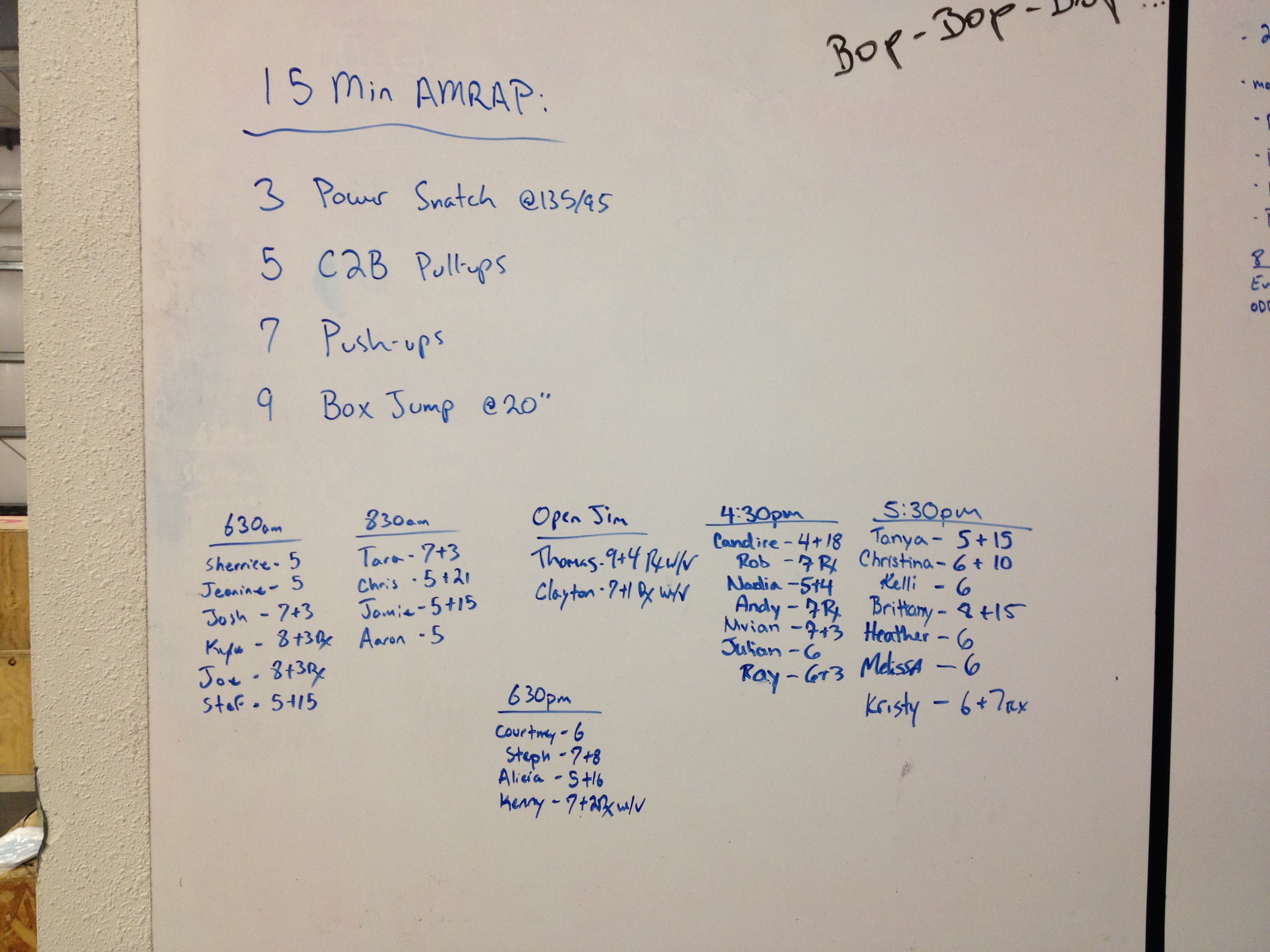 May 12, 2014 WOD Posted onMay 11, 2014May 12, 2014AuthorClaytonLeave a comment 15 Minute AMRAP: 3 Power Snatch 135/95lbs 5 Chest to Bar Pull Ups 7 Push Ups 9 Box Jumps 20in.