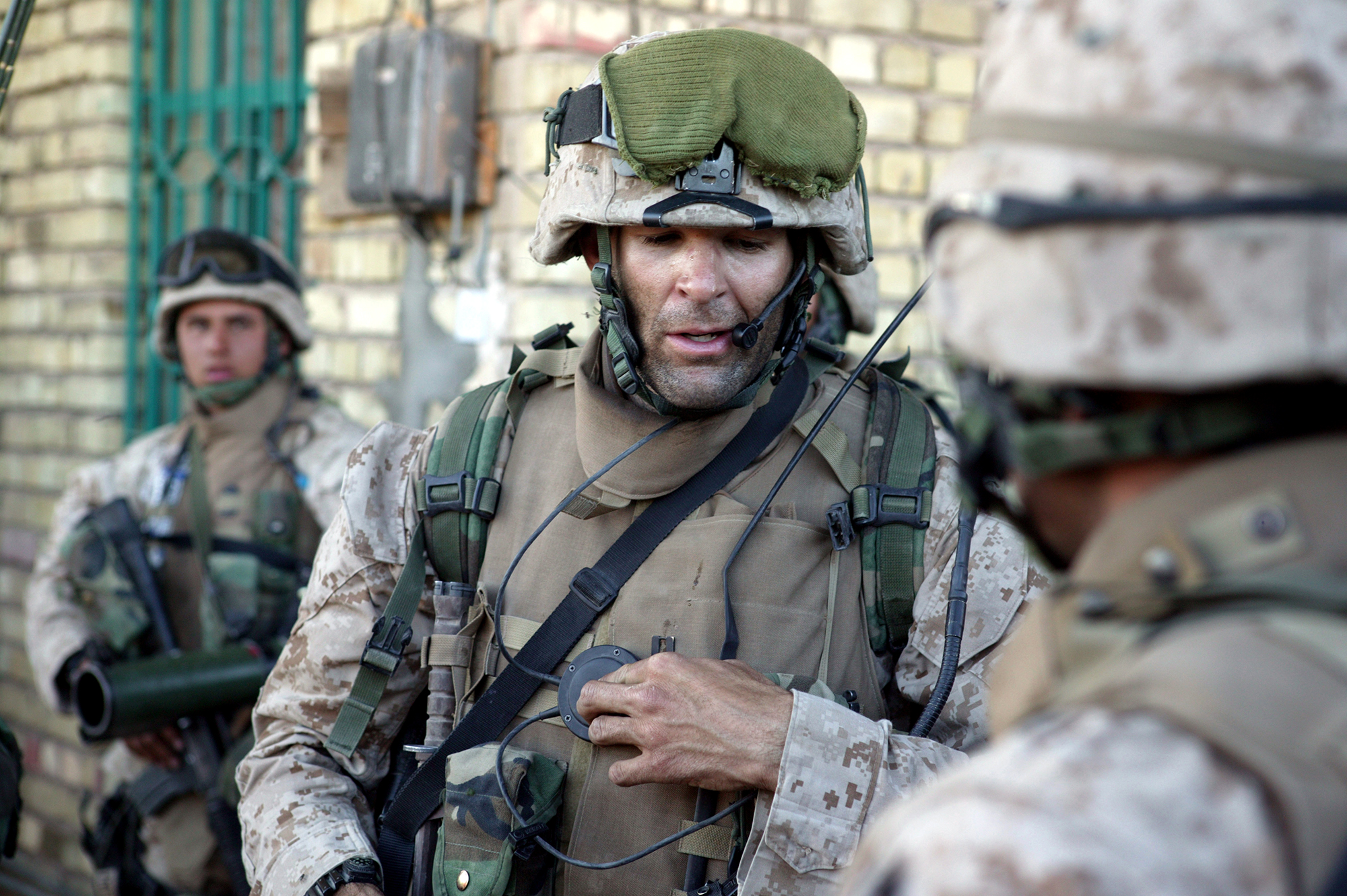 Capt. Doug Zembiec, the commanding officer of Company E, 2nd Battalion, 1st Marine Regiment, 1st Marine Division, gives orders to his men over a radio prior to leaving their secured compound for a short patrol in Fallujah, Iraq April 8, 2004.The company entered Fallujah April 6 to begin the effort of destroying enemy holded up in the city. (Official USMC photo by Sgt. Jose E. Guillen)