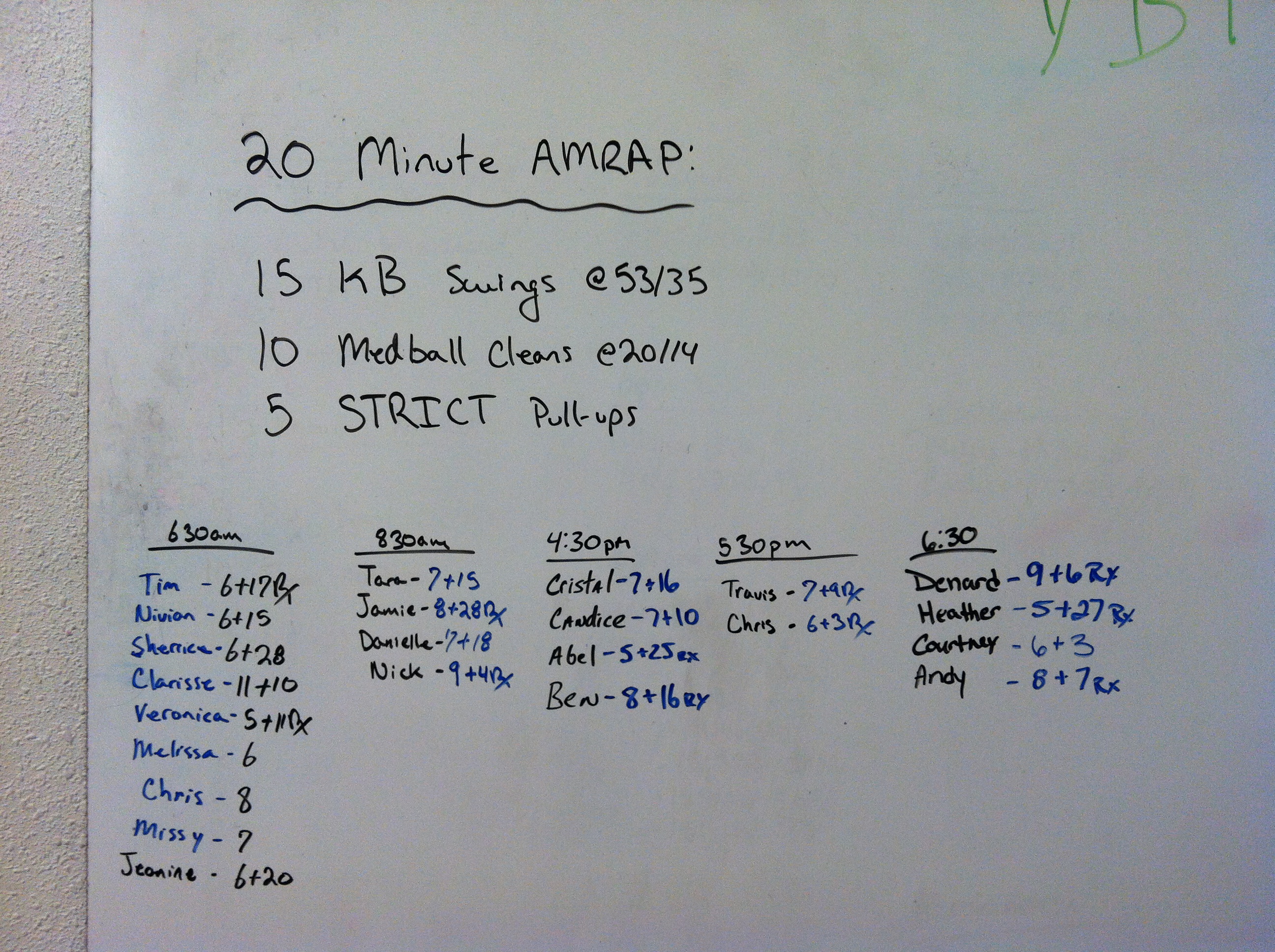 June 17, 2014 WOD Posted onJune 16, 2014June 17, 2014AuthorClaytonLeave a comment 20 Minute AMRAP: 15 KB swings @53/35lb. 10 Medball cleans @20/14lb. 5 Strict pull-ups