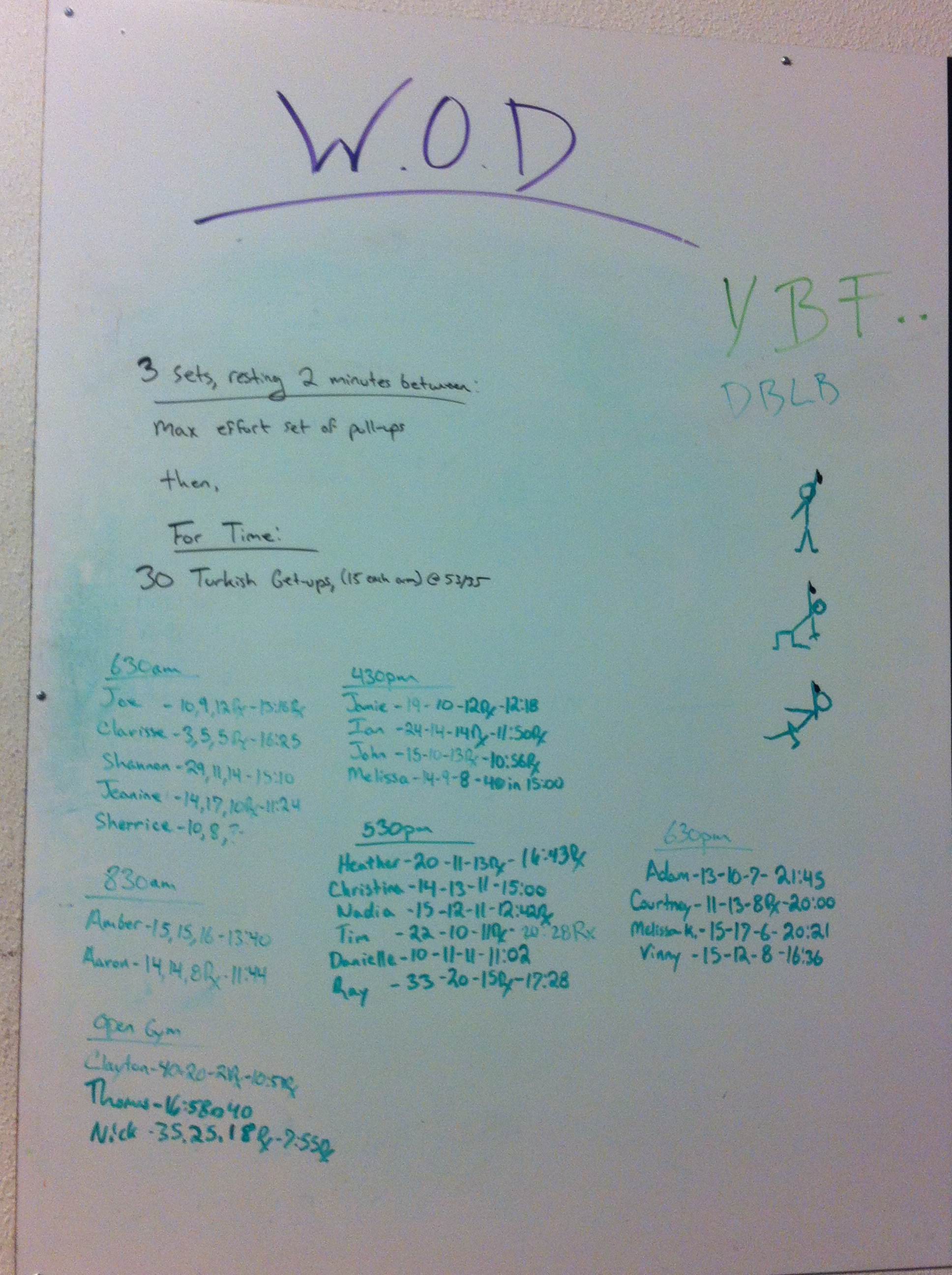 August 26, 2014 WOD Posted onAugust 25, 2014August 26, 2014AuthorClaytonLeave a comment 3 sets, resting precisely 2 minutesĀ in-between: Max unbroken pull-ups (without dropping from the bar) then, For Time: 3o Turkish get-ups, 15 per arm @53/35