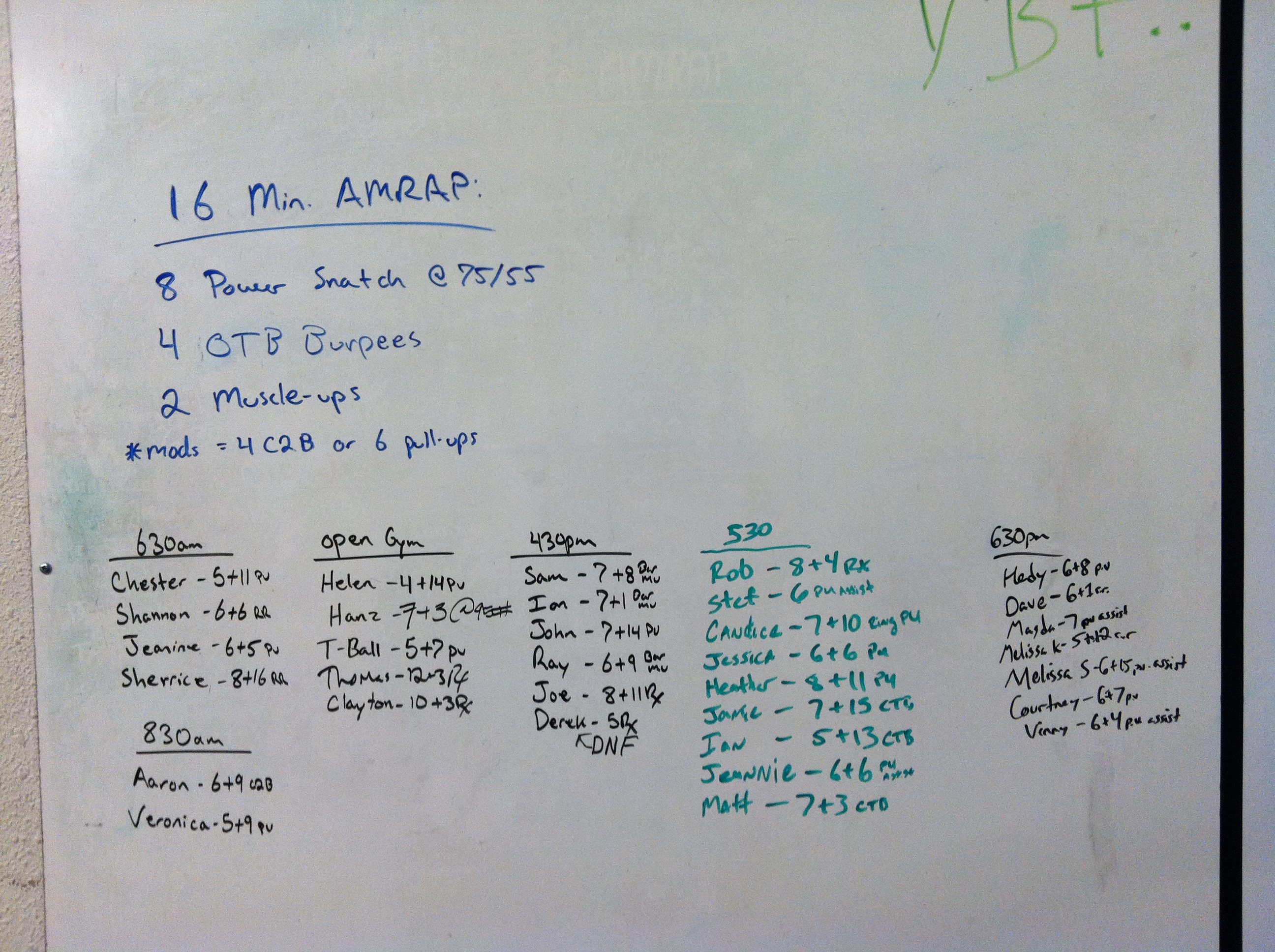 September 15, 2014 WOD Posted onSeptember 14, 2014September 15, 2014AuthorClaytonLeave a comment 16 Minute AMRAP: 8 Power Snatch 75lbs/55lbs 4 Over the box Burpees 24in/20in 2 Muscle Ups or 4 Chest to Bar Pull Ups or 6 Pull ups