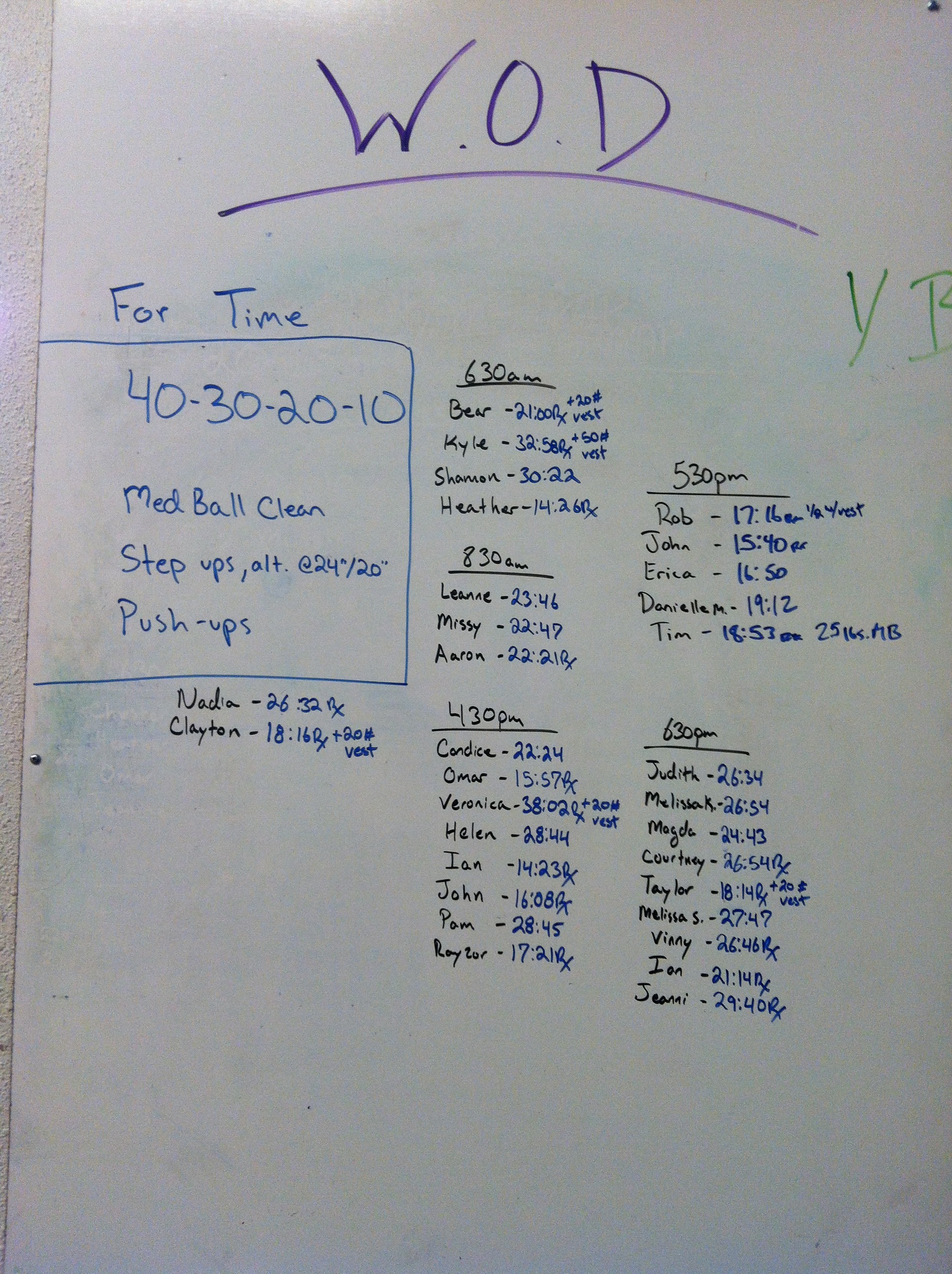 September 23, 2014 WOD Posted onSeptember 22, 2014September 23, 2014AuthorClaytonLeave a comment 40-30-20-10 Medball clean @20/14 Step ups to 24″/20″ Push-ups