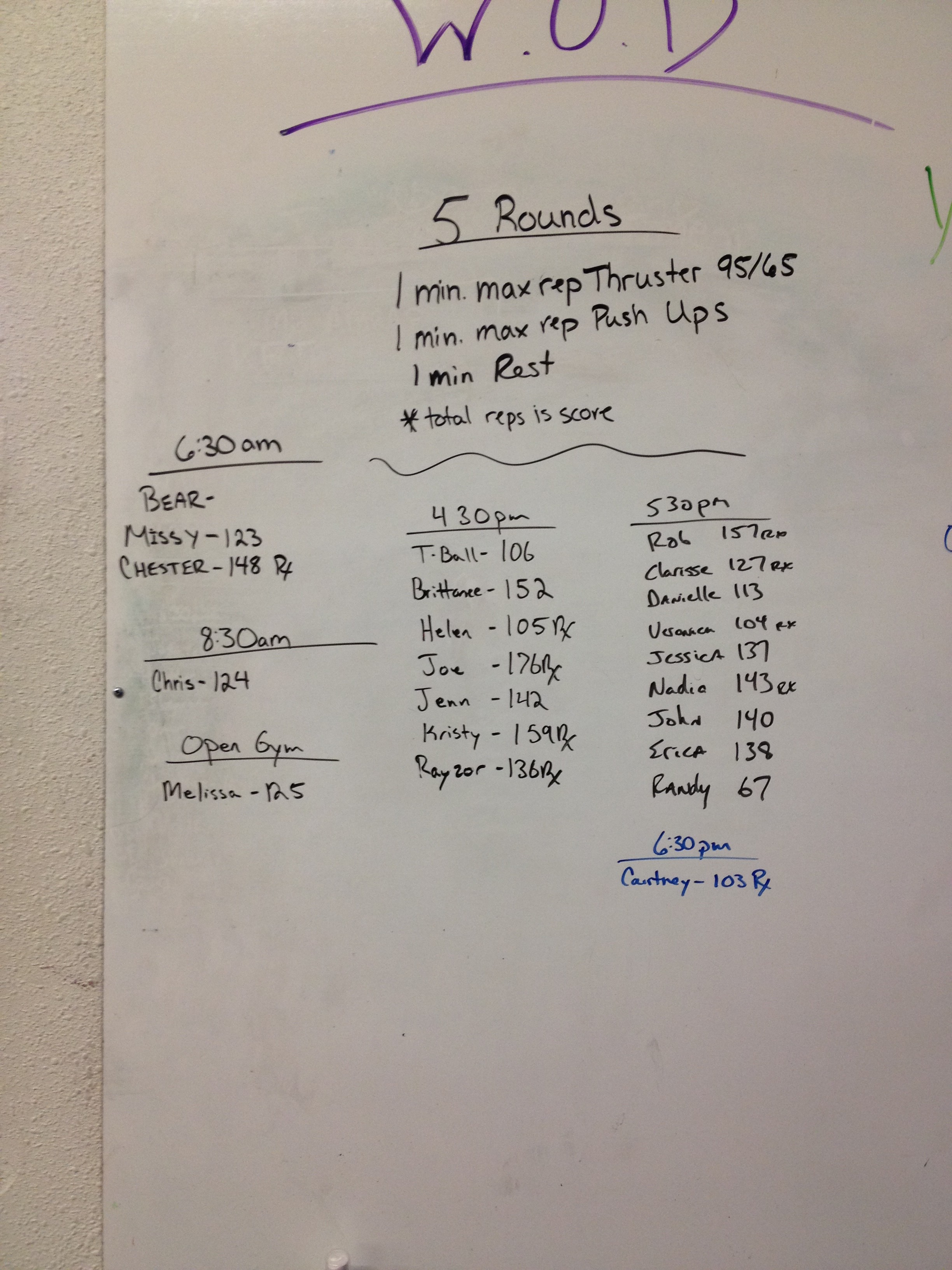 October 9, 2014 WOD Posted onOctober 8, 2014October 9, 2014AuthorClaytonLeave a comment 5 Rounds of: 1 Minute max rep thrusters @95/65 1 Minute max rep push-ups 1 Minute Rest *Score is total repetitions.