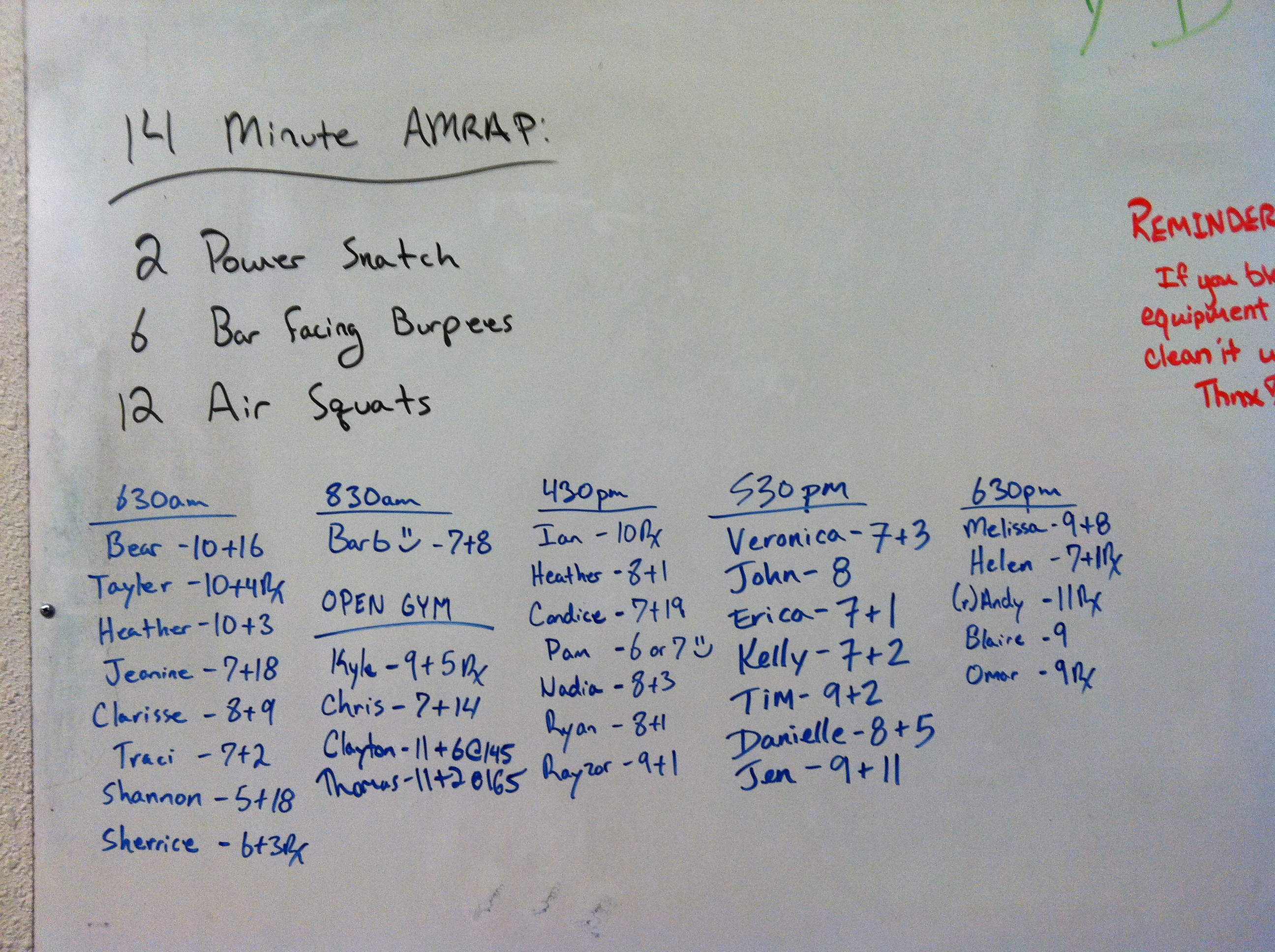 October 21, 2014 WOD Posted onOctober 20, 2014October 21, 2014AuthorClaytonLeave a comment 14 Minute AMRAP: 2 Power snatch @135/95 6 Bar facing burpees 12 Air squats
