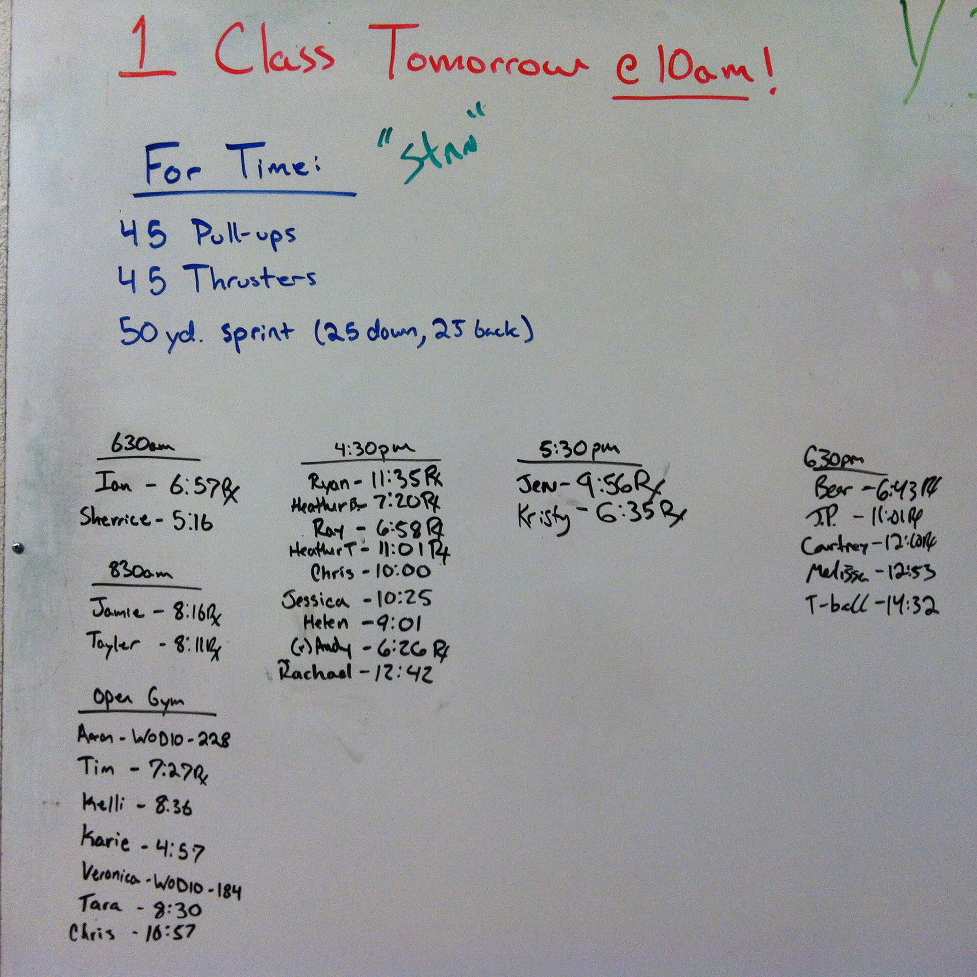 November 10, 2014 WOD Posted onNovember 9, 2014November 10, 2014AuthorClaytonLeave a comment For Time: 45 Pull-ups 45 Thrusters @95/65 50 Yard shuttle sprint (25 down, 25 back)