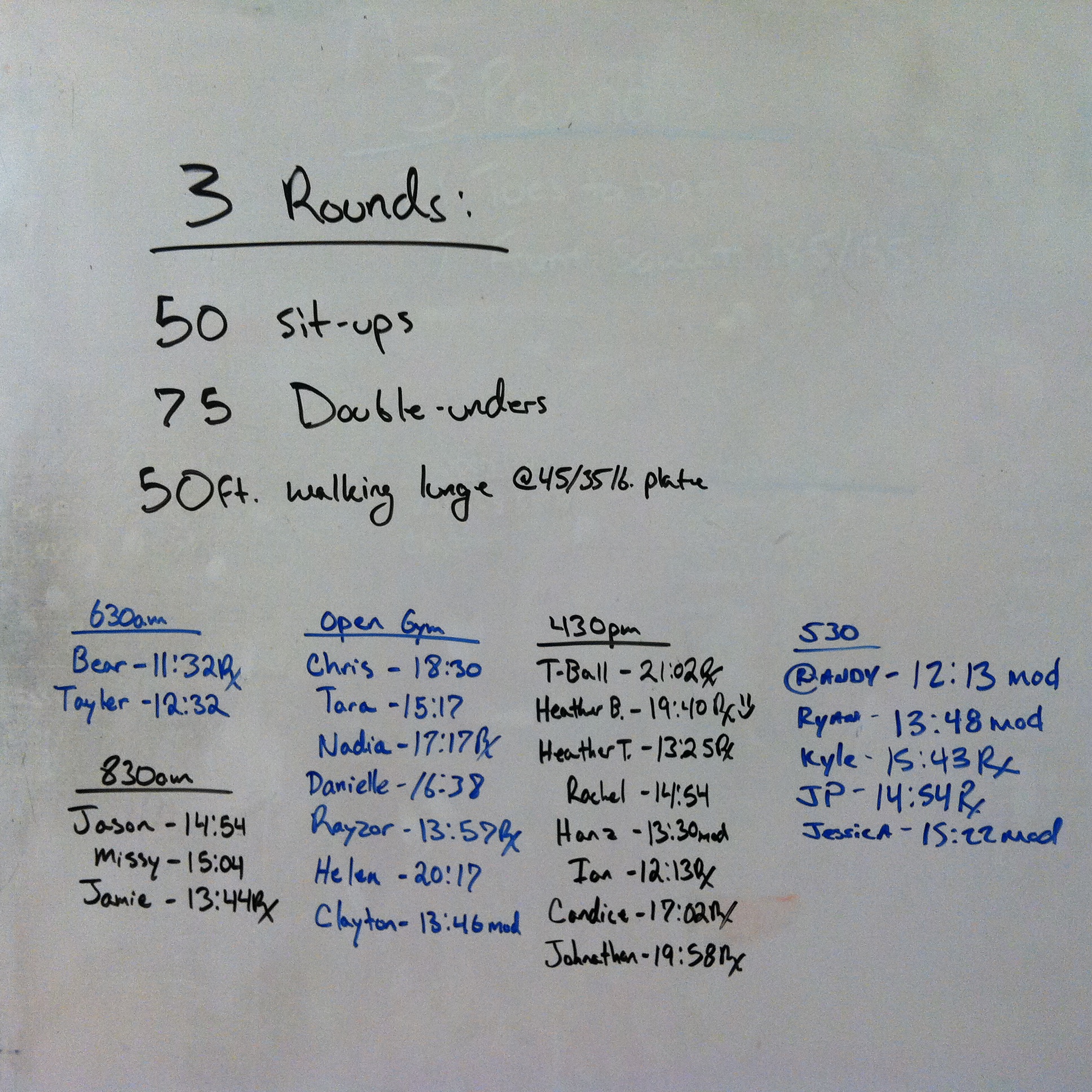 November 13, 2014 WOD Posted onNovember 12, 2014November 13, 2014AuthorClaytonLeave a comment 3 Rounds for Time: 50 Sit-ups 75 Double unders 50ft. walking lunge steps @45/35lb. plate