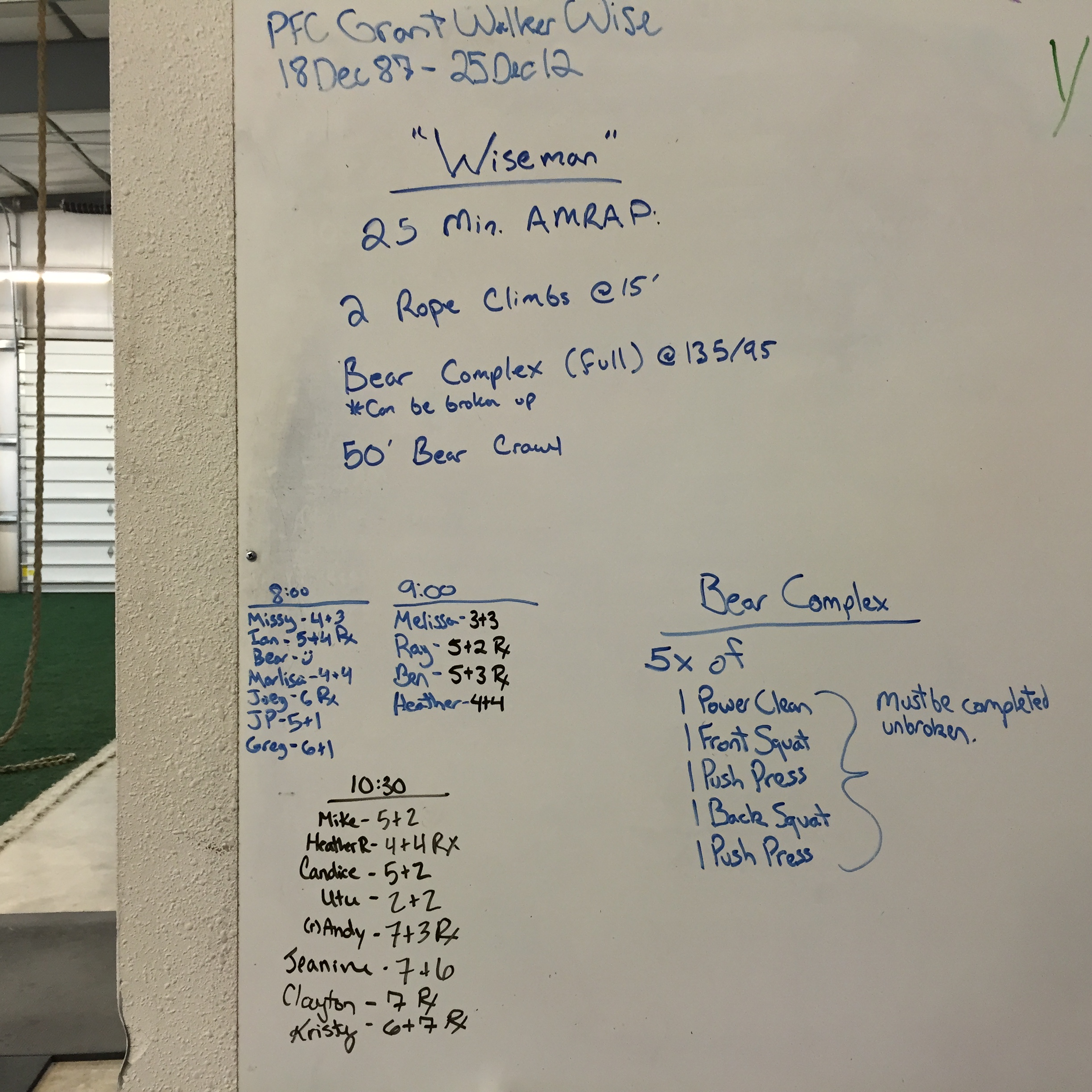 January 31, 2015 Posted onFebruary 1, 2015AuthorClaytonLeave a comment “Wiseman” 25 Minute AMRAP: 2 Rope Climbs, 15 ft 1 Bear Complex 135/95 50 ft Bear Crawl