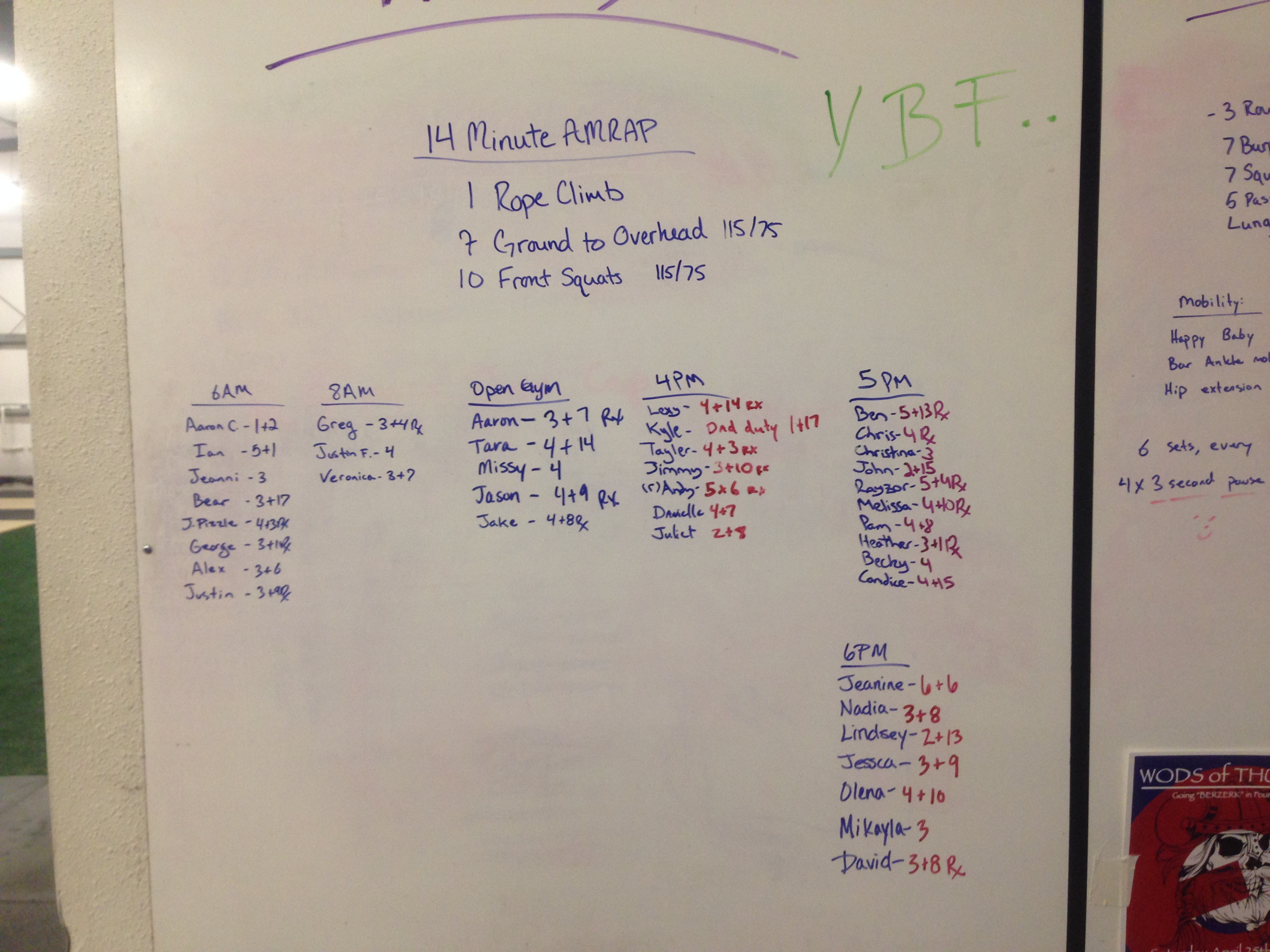 March 17, 2015 WOD Posted onMarch 16, 2015March 18, 2015AuthorClaytonLeave a comment 14 Minute AMRAP: 1 Rope climb to 15′ 7 Ground to Overhead @115/75 10 Front squats @115/75