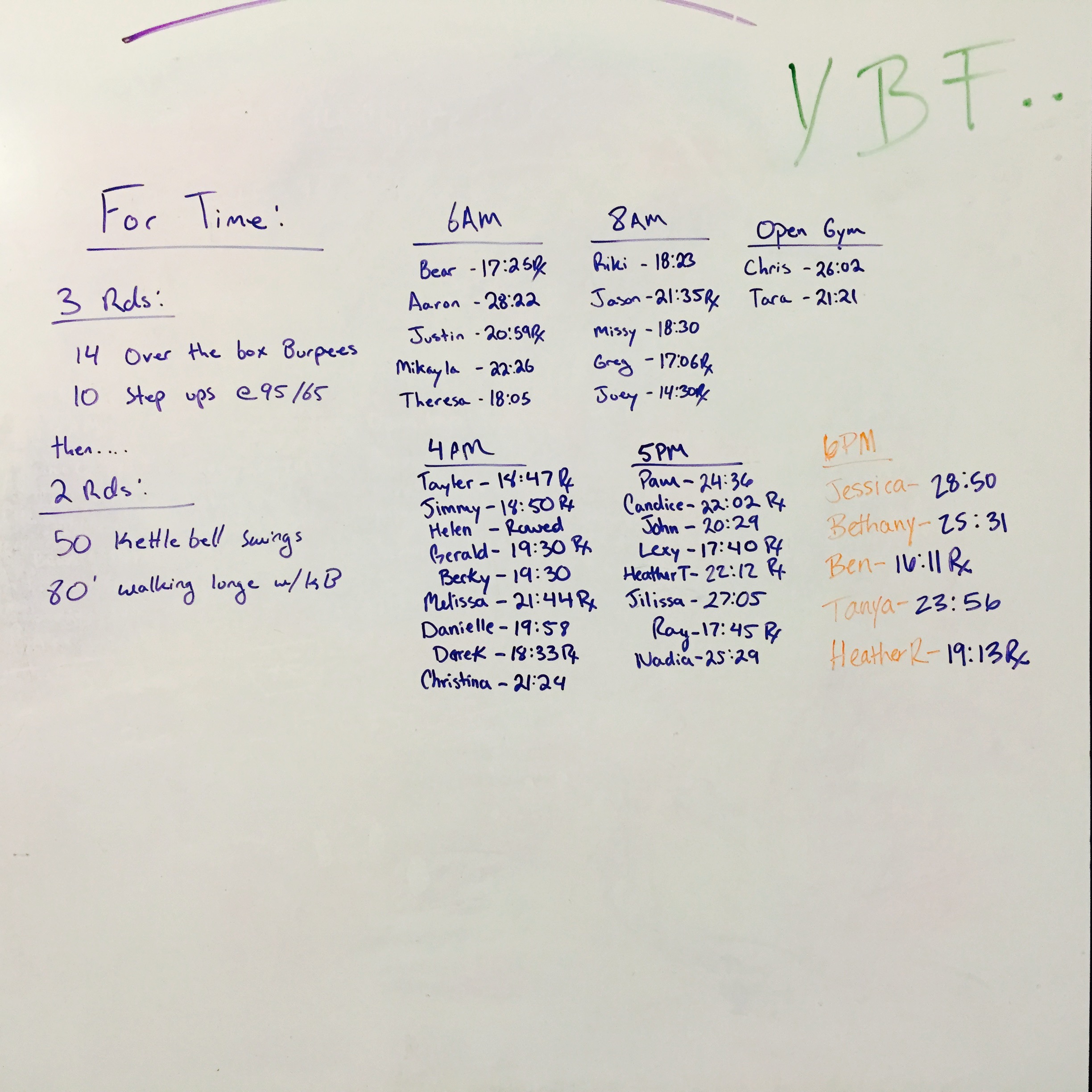 March 18, 2015 WOD Posted onMarch 17, 2015March 18, 2015AuthorClaytonLeave a comment All for Time: 3 Rounds of: 14 Over the box burpees @20″ 10 Step ups,alt. @95/65 (back rack) then, 2 rounds: 50 Kettle bell swings @53/35 80′ Walking lunge with kettle bell (front rack)
