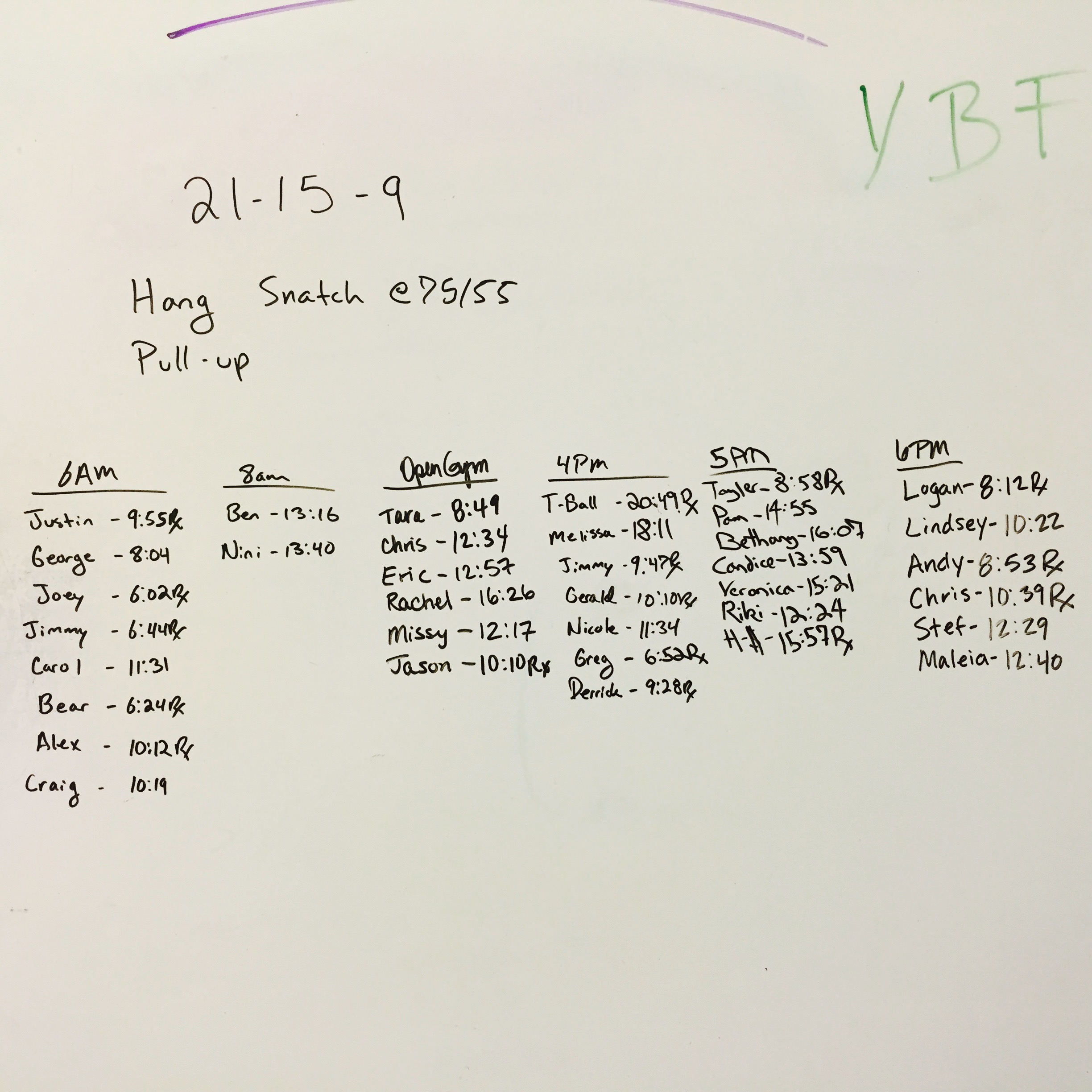 March 24, 2015 WOD Posted onMarch 23, 2015March 24, 2015AuthorClaytonLeave a comment For Time: 21-15-9 Hang squat snatch @75/55 Pull-up