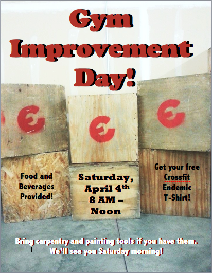 April 4, 2015 Gym Improvement Day! Posted onApril 3, 2015April 5, 2015AuthorClaytonLeave a comment Was a huge success! Thank you so much to all of the great members and their families that came out to help make the box a better place! We finished all of the projects we had planned thanks to all of the help!