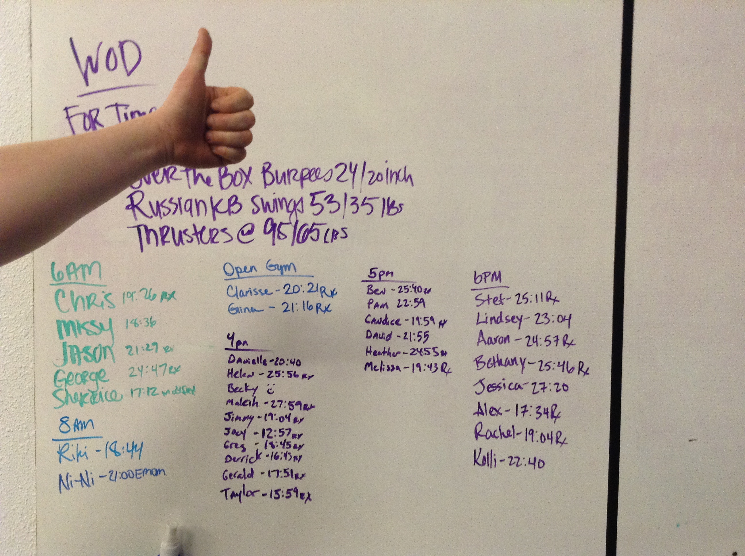 April 21, 2015 WOD Posted onApril 20, 2015April 21, 2015AuthorClaytonLeave a comment For Time: 30-20-10 Over the box Burpees 24/20in Russian KB swings 53/35lbs Thrusters @95/65