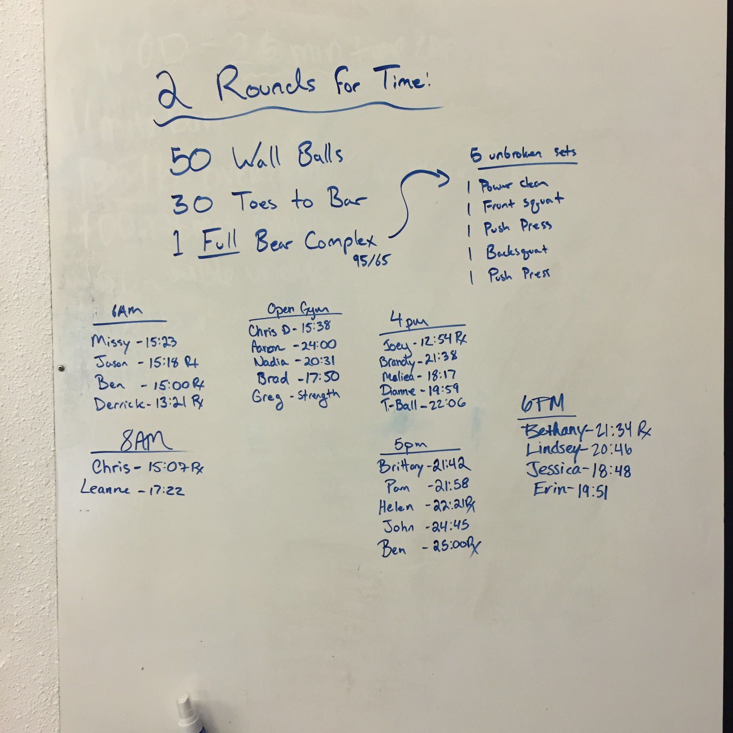 May 13, 2015 WOD Posted onMay 12, 2015May 13, 2015AuthorClaytonLeave a comment 2 Rounds for Time: 50 Wall balls 20/14 to 10′ 30 Toes to bar 1 Full bear complex 95/65
