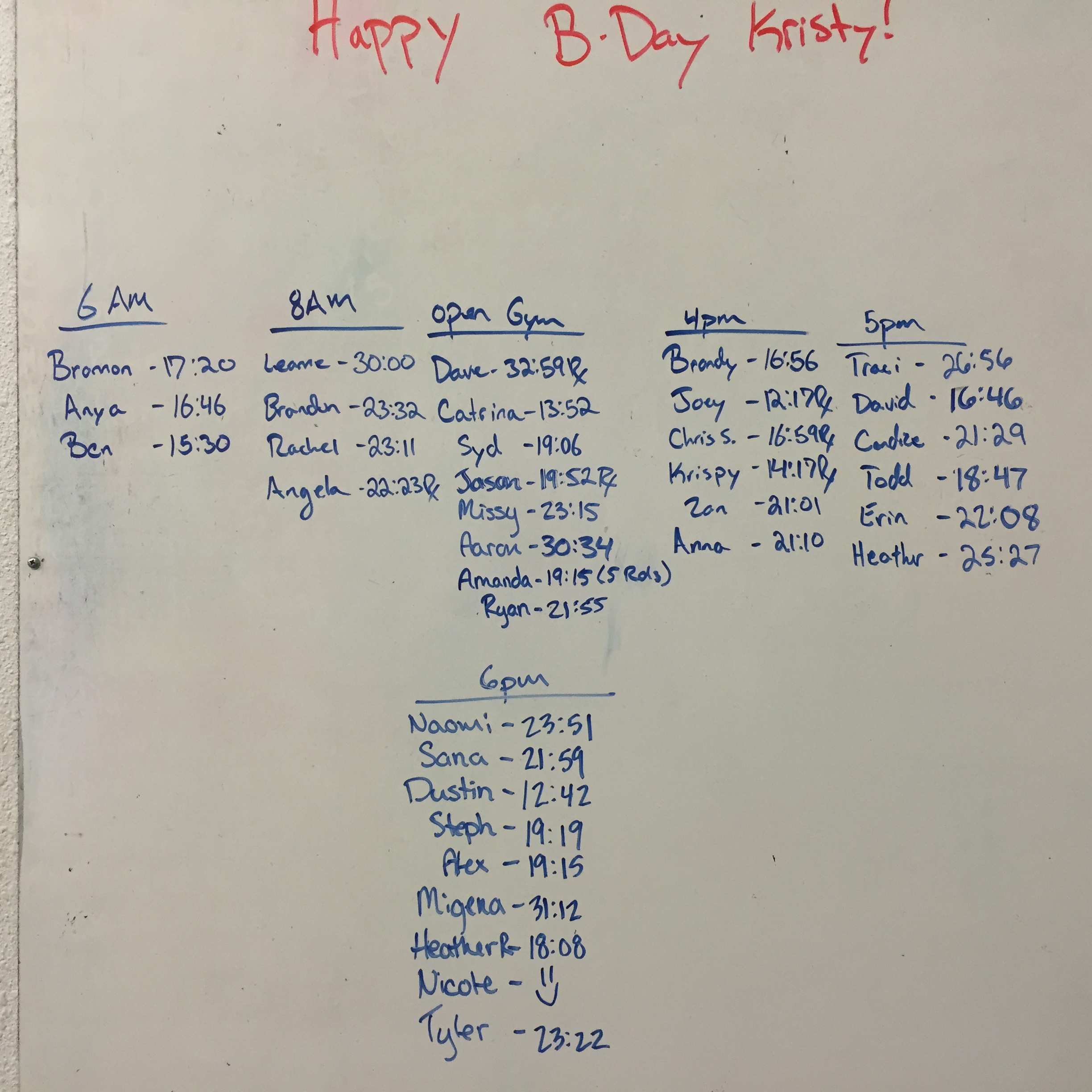 August 12, 2015 WOD Posted onAugust 12, 2015AuthorClaytonLeave a comment Happy (belated) Birthday Kristy! For Time: buy in of 20 Calorie Row 6 Bar muscle-ups then, 8 Rounds of: 10 Hang power clean –> Shoulder to Overhead @95/65 15 Double Unders