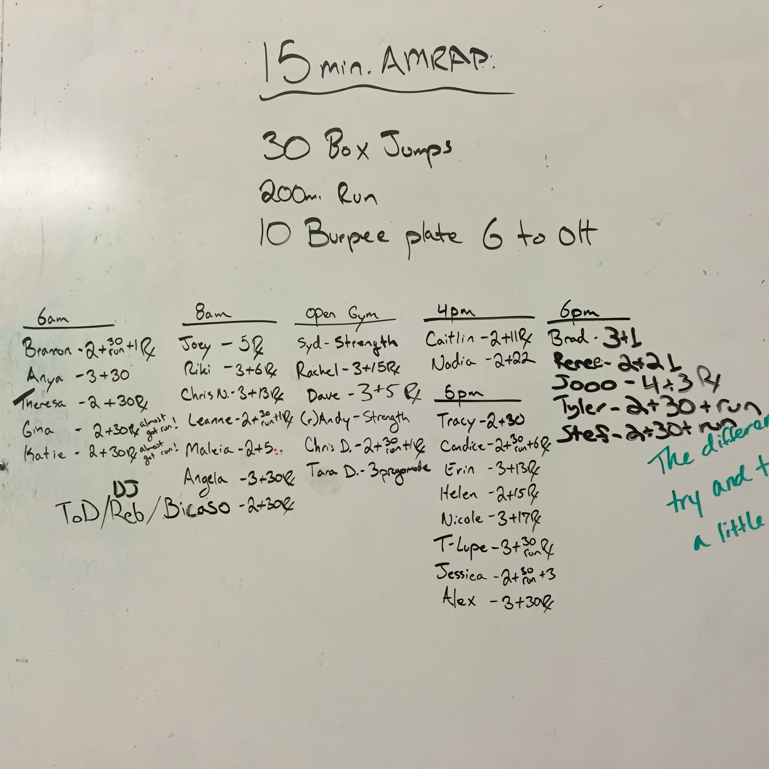 September 4, 2015 WOD Posted onSeptember 6, 2015AuthorClaytonLeave a comment 15 Minute AMRAP: 30 Box Jumps @24″/20″ 200m. Sprint 10 Burpee plate ground to overhead @45/35
