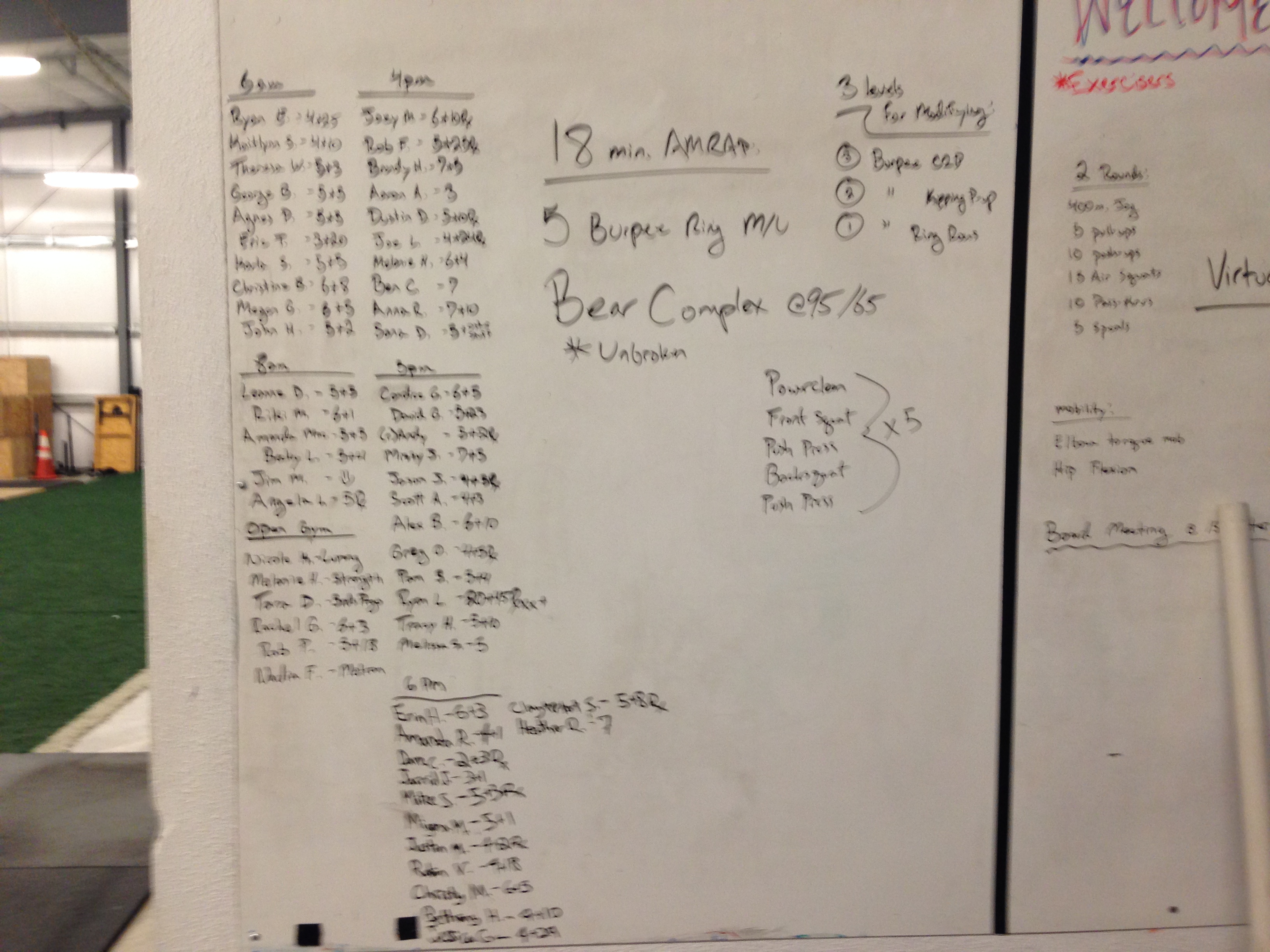 October 19, 2015 WOD Posted onOctober 20, 2015AuthorClaytonLeave a comment 18 Minute AMRAP: 5 Burpee Ring Muscle ups 1 Full Bear Complex (unbroken) @95/65