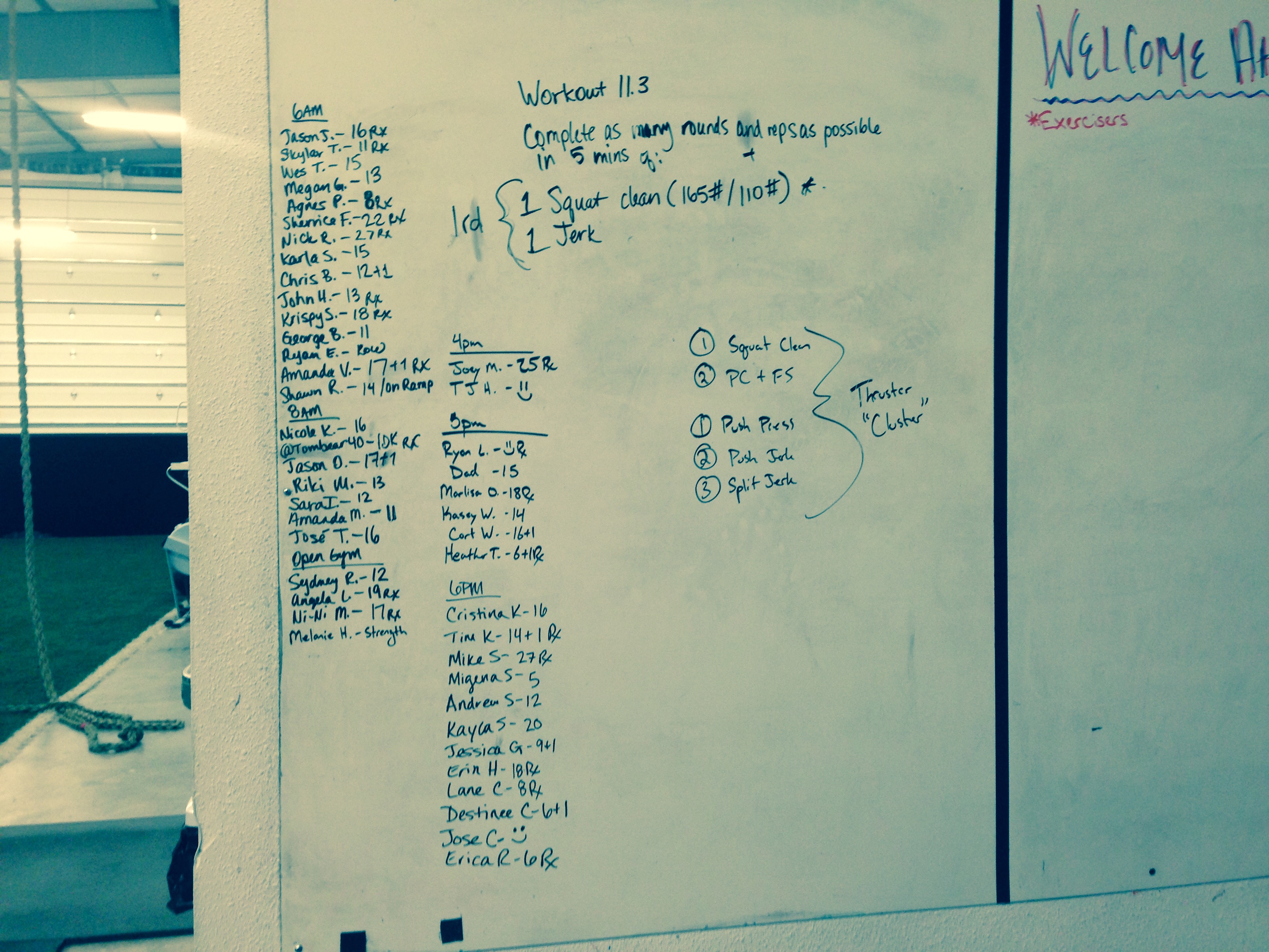 February 18, 2016 WOD Posted onFebruary 21, 2016February 14, 2017AuthorClaytonLeave a comment WORKOUT 11.3 Complete as many rounds and reps as possible in 5 minutes of: Squat clean (165lb / 110lb) Jerk