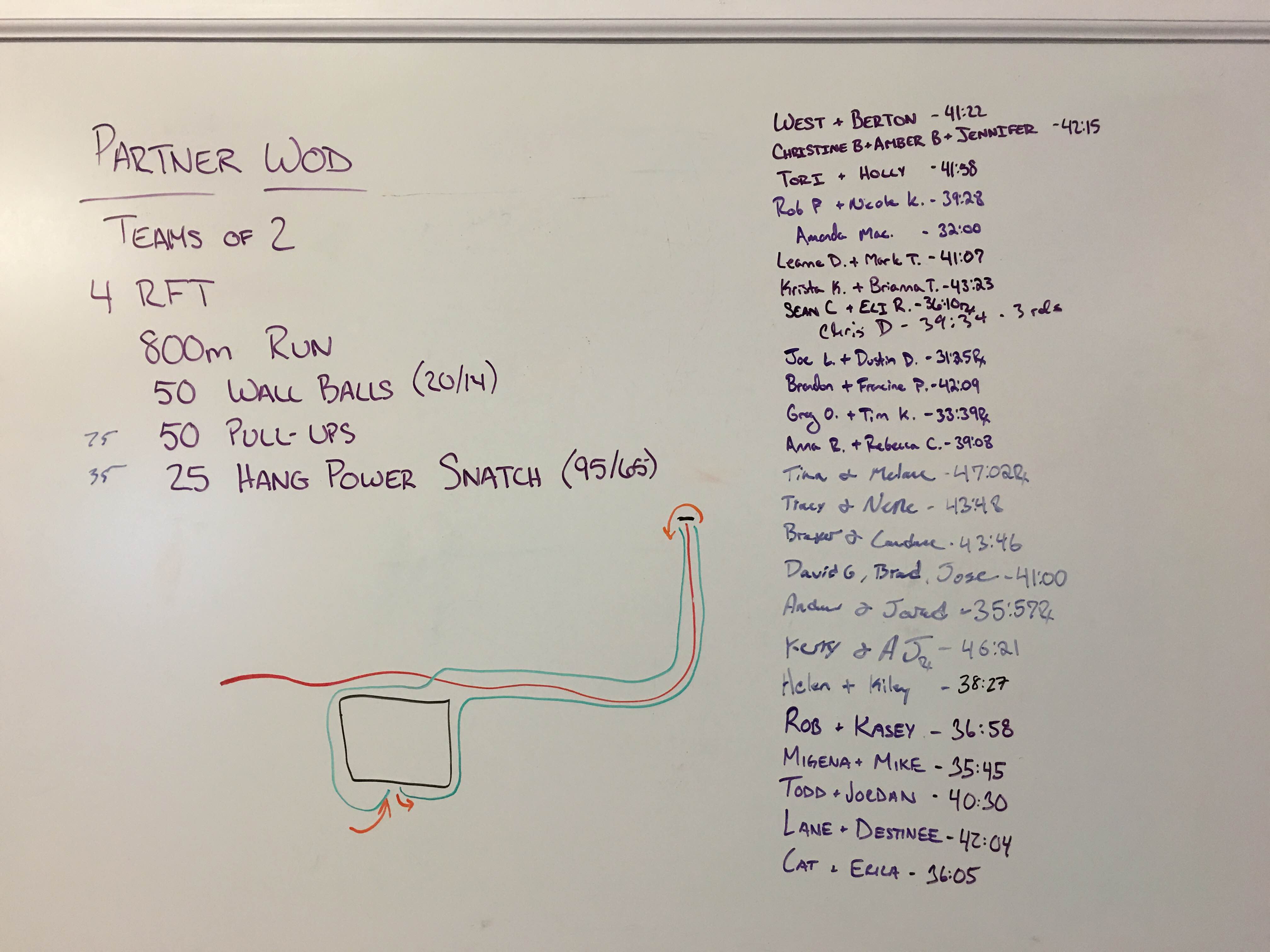 *when the WOD begins, 1 partner runs the 800m. While the other completes 50 wall balls. As soon as both partners are done with their tasks they move together to the pullups, then the snatches. The pull-ups must be finished before the snatch and only one partner may work at a time, however the team can break up the reps however you want. The next round, partner rolls change for the run/wall ball portion.
