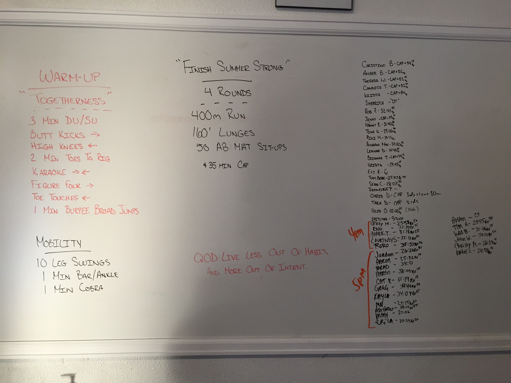 August 1, 2016 WOD Posted onAugust 2, 2016AuthorClaytonLeave a comment 4 Rounds for Time: 400m run (trail) Walking lunge 160′ with Dumbbells 50 abmat situps
