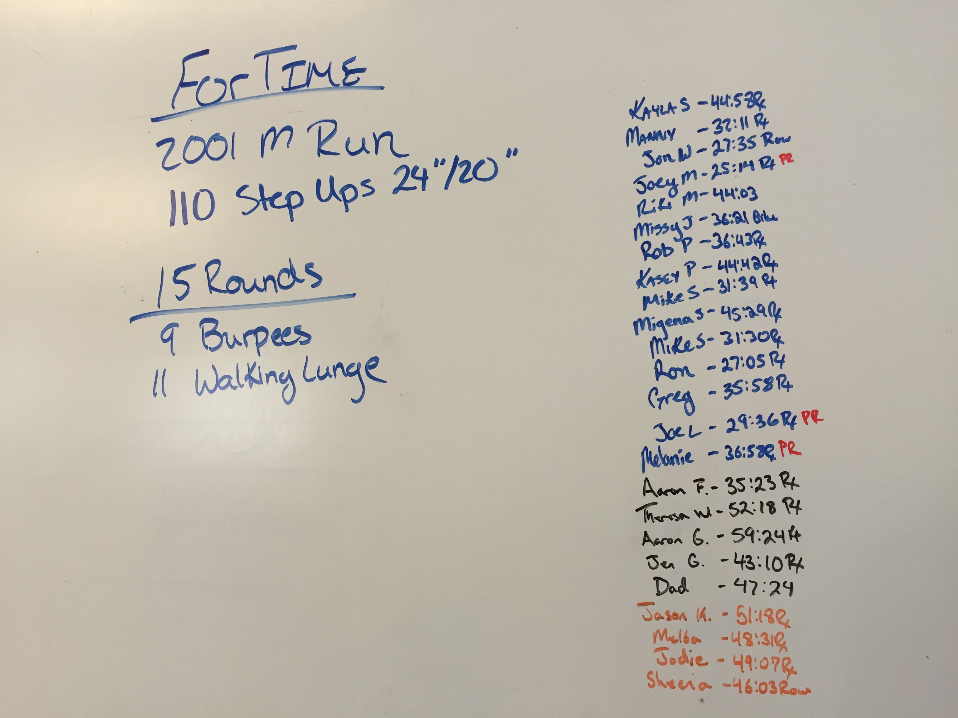 September 10, 2016 Hero WOD Posted onSeptember 11, 2016AuthorClaytonLeave a comment 9/11 Memorial WOD: For Time: 2001m. Run 110 Step ups @24″/20″ 15 Rounds of: 9 Burpees 11 Walking lunges, alt.