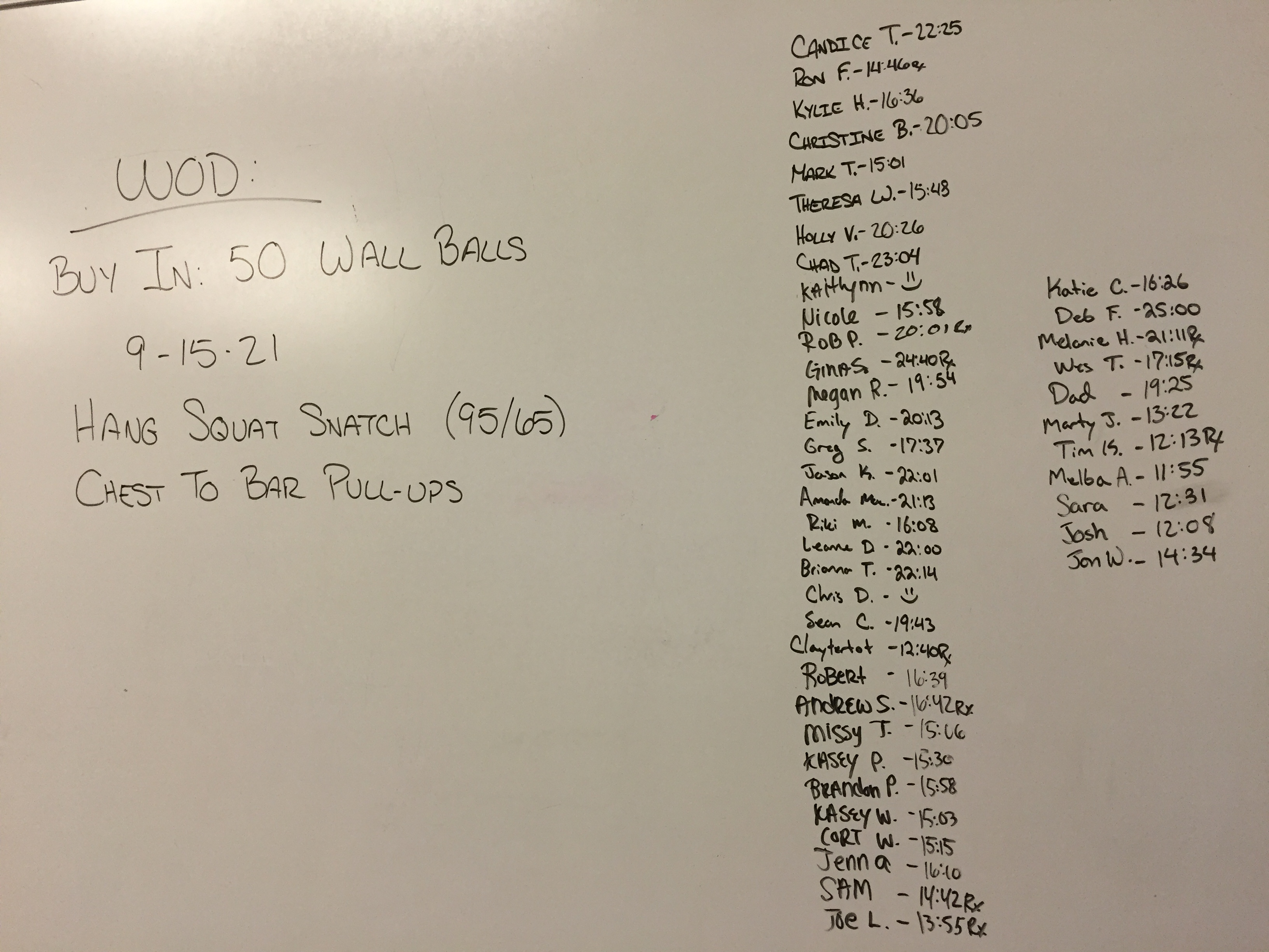 September 21, 2016 WOD Posted onSeptember 21, 2016September 21, 2016AuthorClaytonLeave a comment For Time: Buy in of 50 Wall Balls @20/14-lb. to 10′ then, 9-15-21 Reps of: Hang Squat Snatch @95/65-lb. Chest to bar pull-ups
