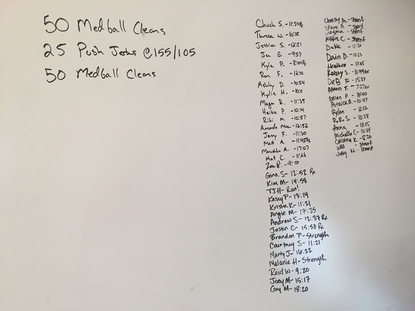 April 18, 2017 WOD Posted onApril 18, 2017April 19, 2017AuthorClaytonLeave a comment For time: 20/14-lb. medicine-ball cleans, 50 reps 155/105-lb. push jerks, 25 reps 20/14-lb. medicine-ball cleans, 50 reps