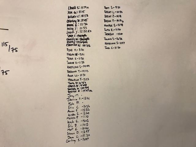 November 29, 2017 WOD Posted onNovember 29, 2017December 2, 2017AuthorClaytonLeave a comment For time: 115/75-lb. overhead squats, 30 reps 15 muscle-ups 115/75-lb. overhead squats, 20 reps 10 muscle-ups